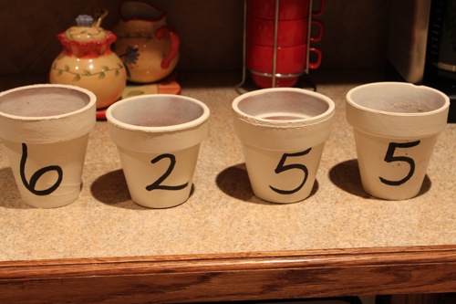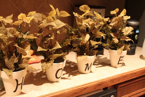 And lastly, I had hubby cut a 2×4 scrap we had in the garage to fit in the space above the door, so it would give the pots some height. Then I painted it the same as our wall color so it would blend in. I put a dab of super glue on the bottom of the pots to the wood. It’s a wide ledge and I slammed the door several times, as a test of course, and they don’t budge.